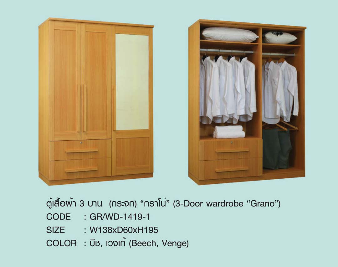 เฟอร์นิเจอร์ไม้ : ตู้เสื้อผ้า 3 บาน (กระจก) "กราโน่" มี 2 สี
